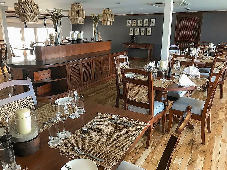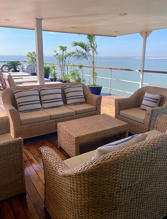 Public spaces onboard are equally inviting. The air-conditioned saloon provides a relaxed setting for socializing or enjoying the mini library, while the dining room serves a variety of freshly prepared meals. A vast sundeck—partly shaded and partly open—is furnished with sofas and sun loungers, perfect for unwinding while taking in the landscape.