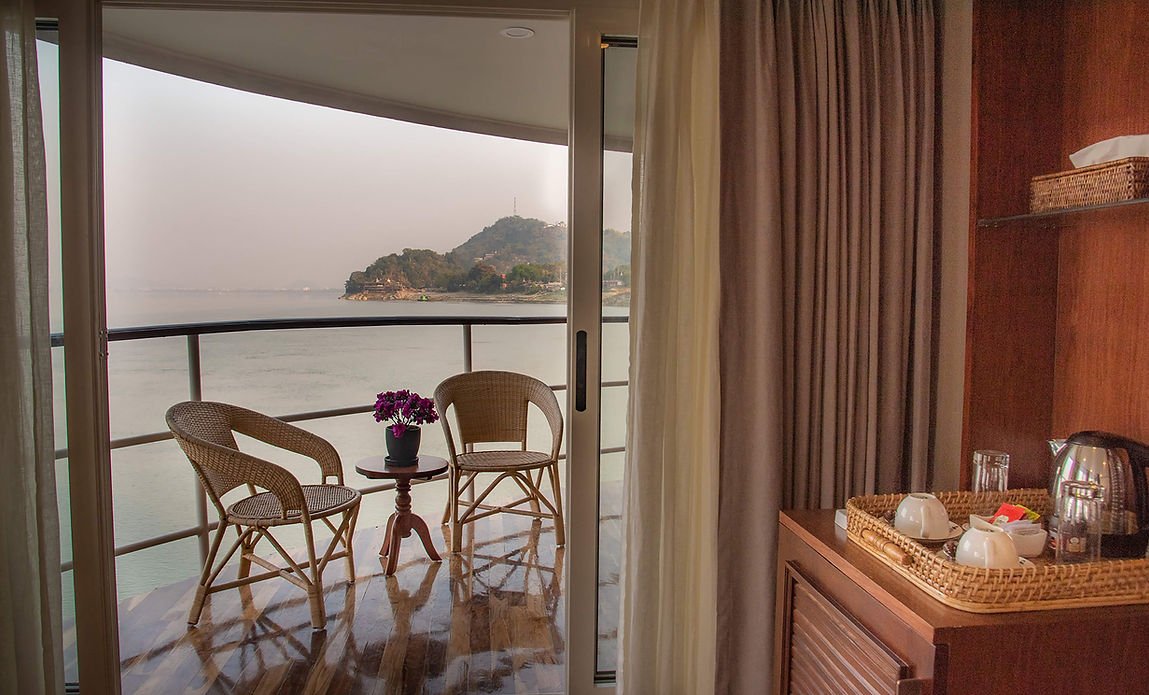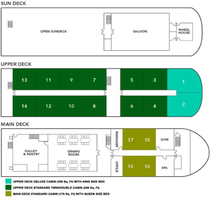The ship accommodates up to 36 guests in 18 thoughtfully designed cabins. On the upper deck, there are two deluxe cabins of 350 square feet each, along with twelve spacious twin or double cabins measuring 240 square feet. Four standard cabins with queen-size beds, each 170 square feet, are located on the main deck and are offered without any supplement. All standard cabins are equipped with French balconies, providing unobstructed views of the river, while the deluxe cabins feature private balconies with seating areas for a more exclusive experience.