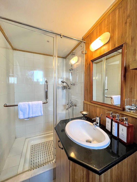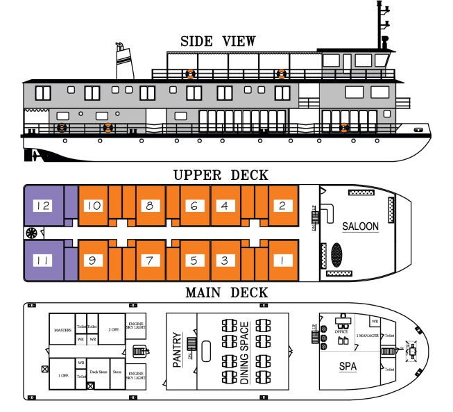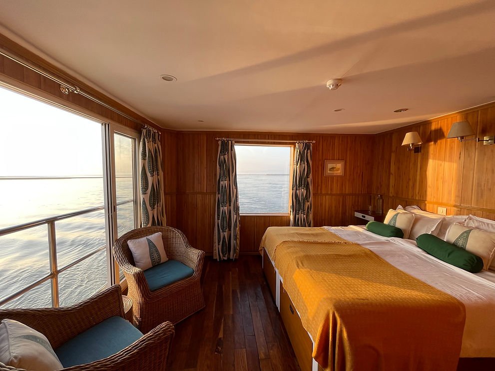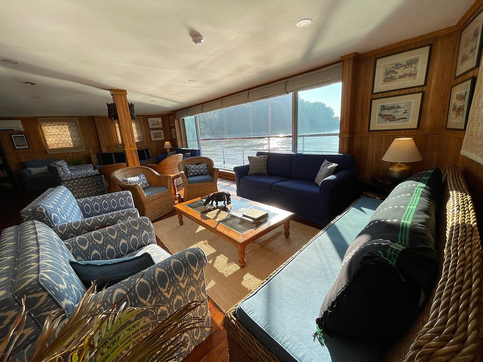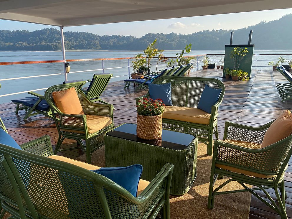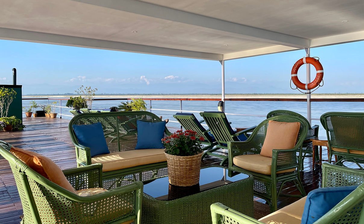 Life on board is both relaxed and refined. The dining room, located on the main deck, serves fresh regional and continental cuisine, while the top-level sundeck is the social heart of the ship. Recently refurbished, the sundeck now boasts new furniture, a stylish bar setup, and ample space for lounging on sunbeds or enjoying the river breeze in cane chairs crafted by local artisans.