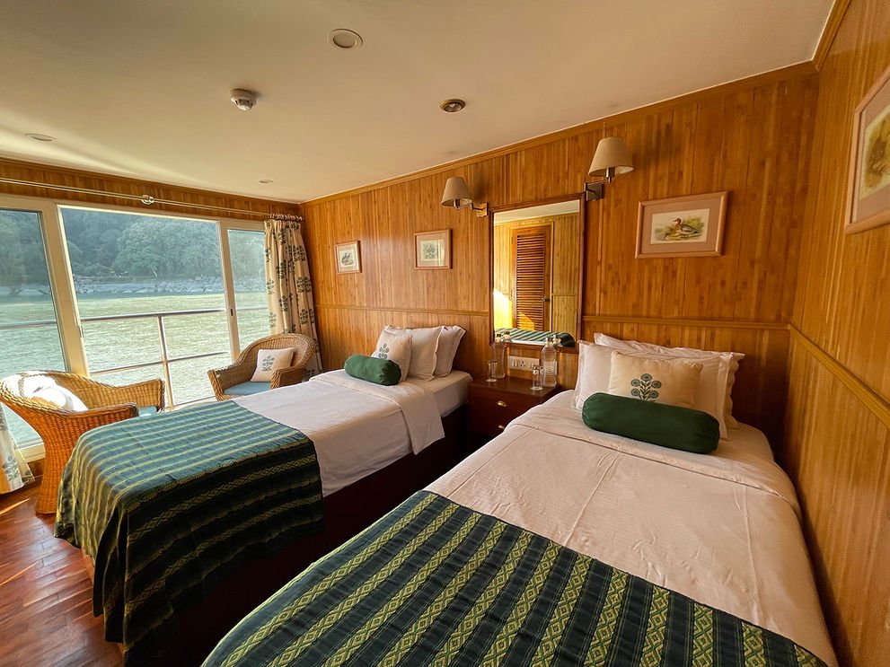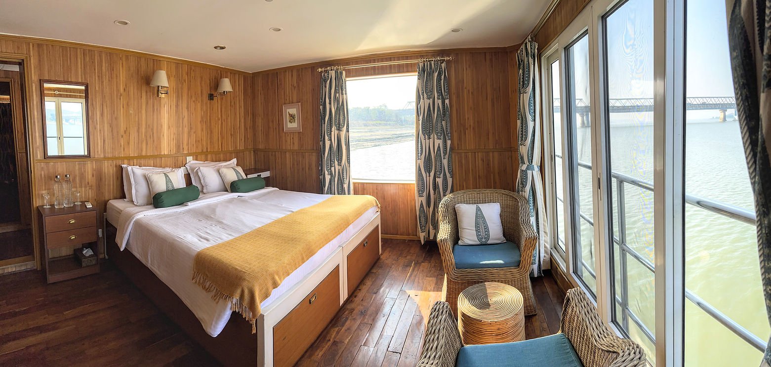 The vessel features 12 spacious upper-deck cabins, all air-conditioned and beautifully bamboo-paneled in a nod to India’s forest conservation efforts. Each cabin comes with an en suite bathroom, French balcony, and large sliding windows that frame sweeping views of the river. Cabins 1 to 10 are twin-bedded with the flexibility to convert into doubles, while cabins 11 and 12 are fitted with double beds. Every cabin is equipped with high-quality linens, generous cupboard space, under-bed storage, and thoughtful touches like hairdryers, ensuring comfort throughout the journey.